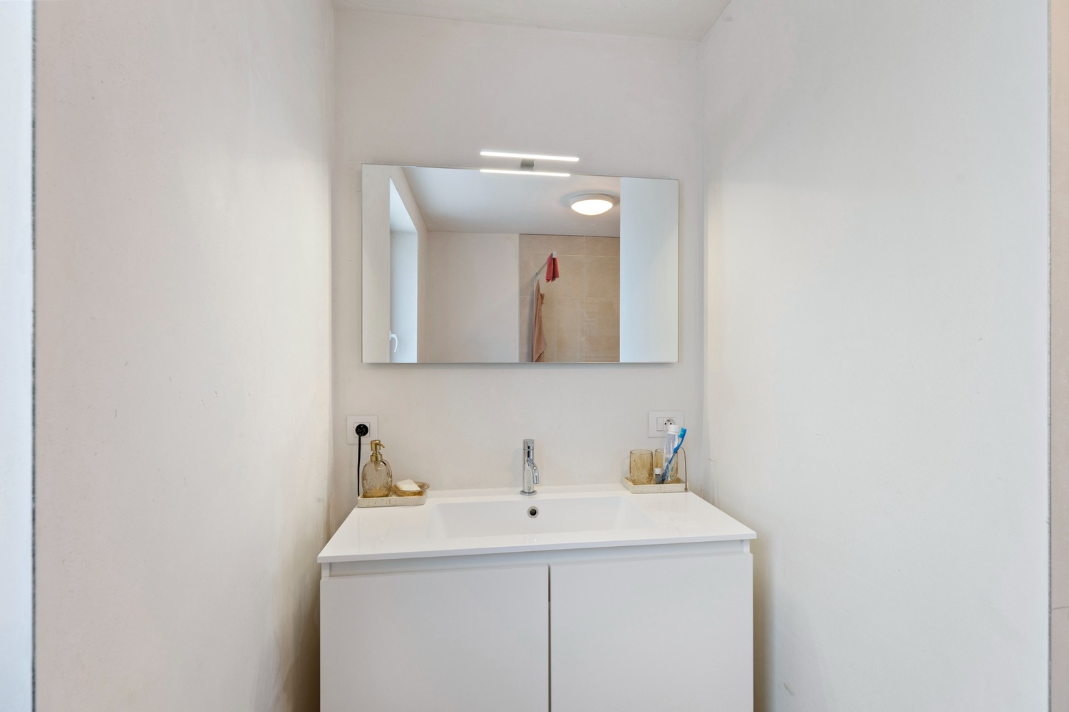 Op de verdieping bevinden zich volwaardige slaapkamers, waaronder een ruime master bedroom met ingemaakte kasten. De badkamer is modern en functioneel ingericht met een inloopdouche, lavabo en voldoende opbergruimte. Alles werd afgewerkt in een rustige, neutrale stijl die tijdloos aanvoelt.